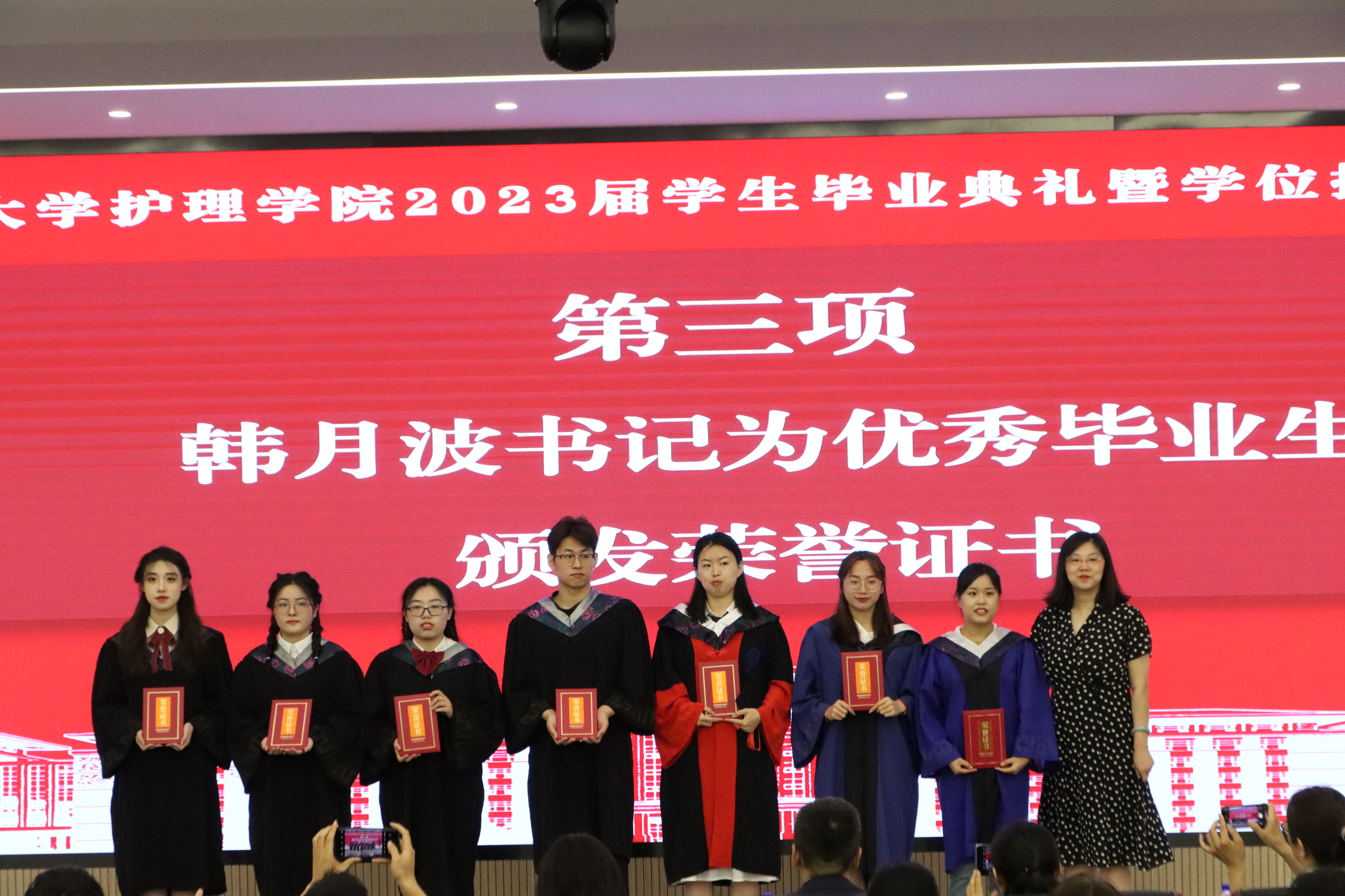 最后,副院长李峰教授致辞。他代表学院向圆满完成学业的毕业生们表示祝贺;向辛勤栽培他们的老师们和抚育他们成长的父母家人们致以崇高的敬意和诚挚的感谢;向在抗击疫情中所有冲锋在前、历经磨砺与成长的志愿者们表示肯定和赞扬。对毕业生提出几点期望。第一,希望同学们终身学习,厚积薄发,永远保持好奇心和求知欲,在不断探索中收获更多的知识和智慧。第二,希望同学们不忘初心,从容致远,牢记白求恩精神和“慎独敦行,仁爱奉献”的院训准则,成为有大爱大德大情怀的护理人和康复人。第三,希望同学们抱负远大,勇攀高峰,树立远大志向,勇敢追求目标,主动把个人发展融入国家复兴大业,争当伟大理想的追梦人。