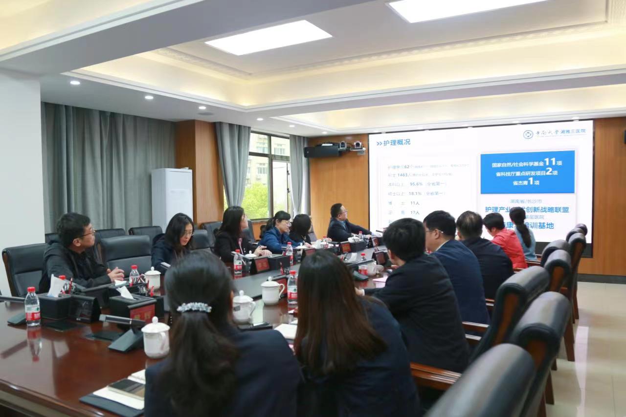 同仁的到来表示欢迎,并对湘雅三医院的区域概况、医院科室设置、人才队伍配备、医院发展等方面进行了介绍,重点介绍了护理部的教学、科研及专科发展近况。