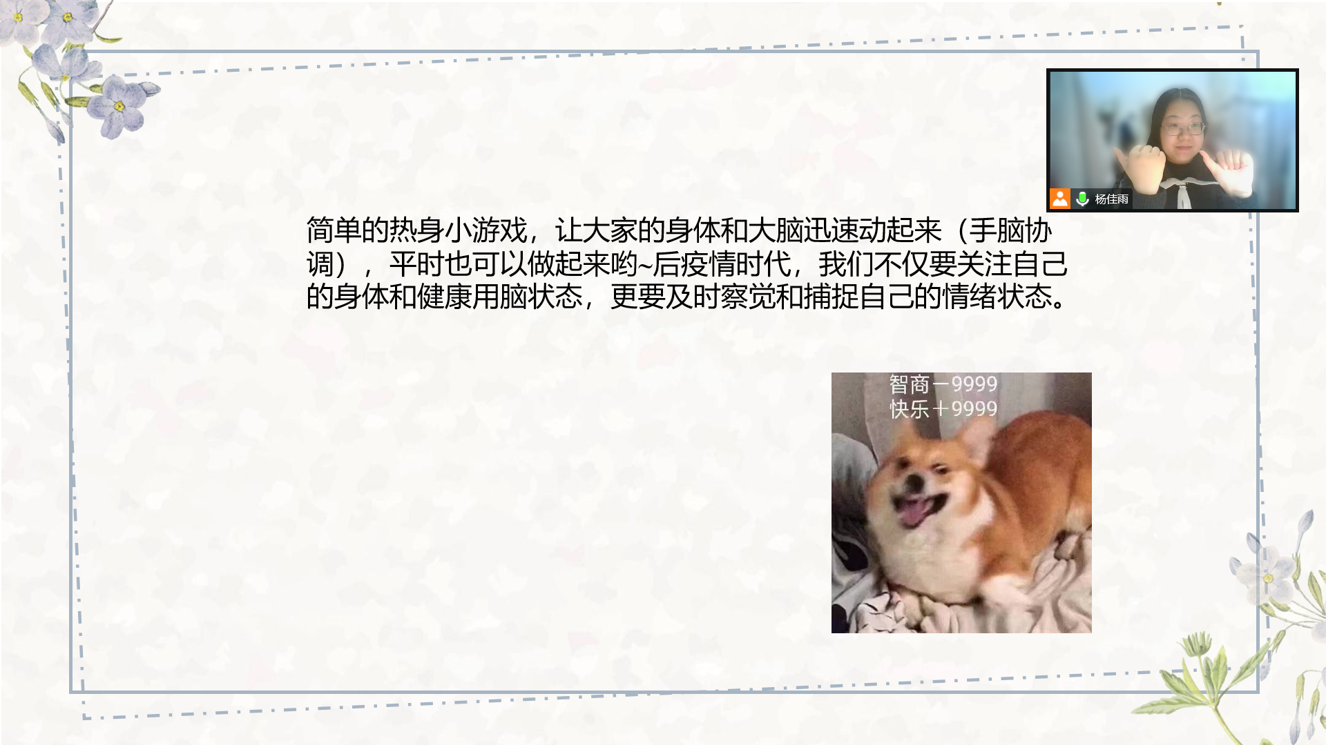 首先,在活动开始时,主持人杨佳雨向同学们介绍了本次活动的主题与目的,接着带领大家学做了一个名为“摇摆时钟”的简单手指操来热身,通过这一手脑协调的小游戏让同学们认识到关注健康用脑状态的重要性。