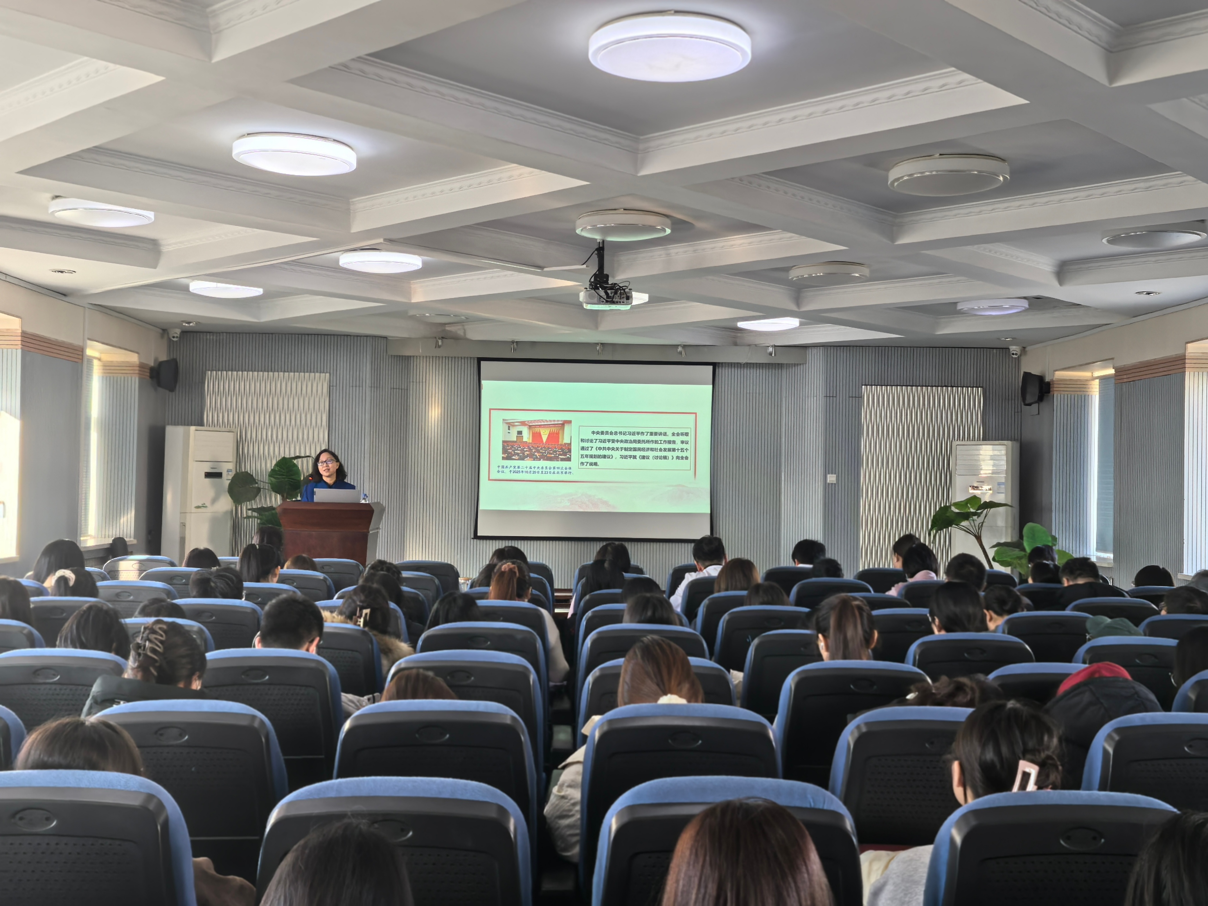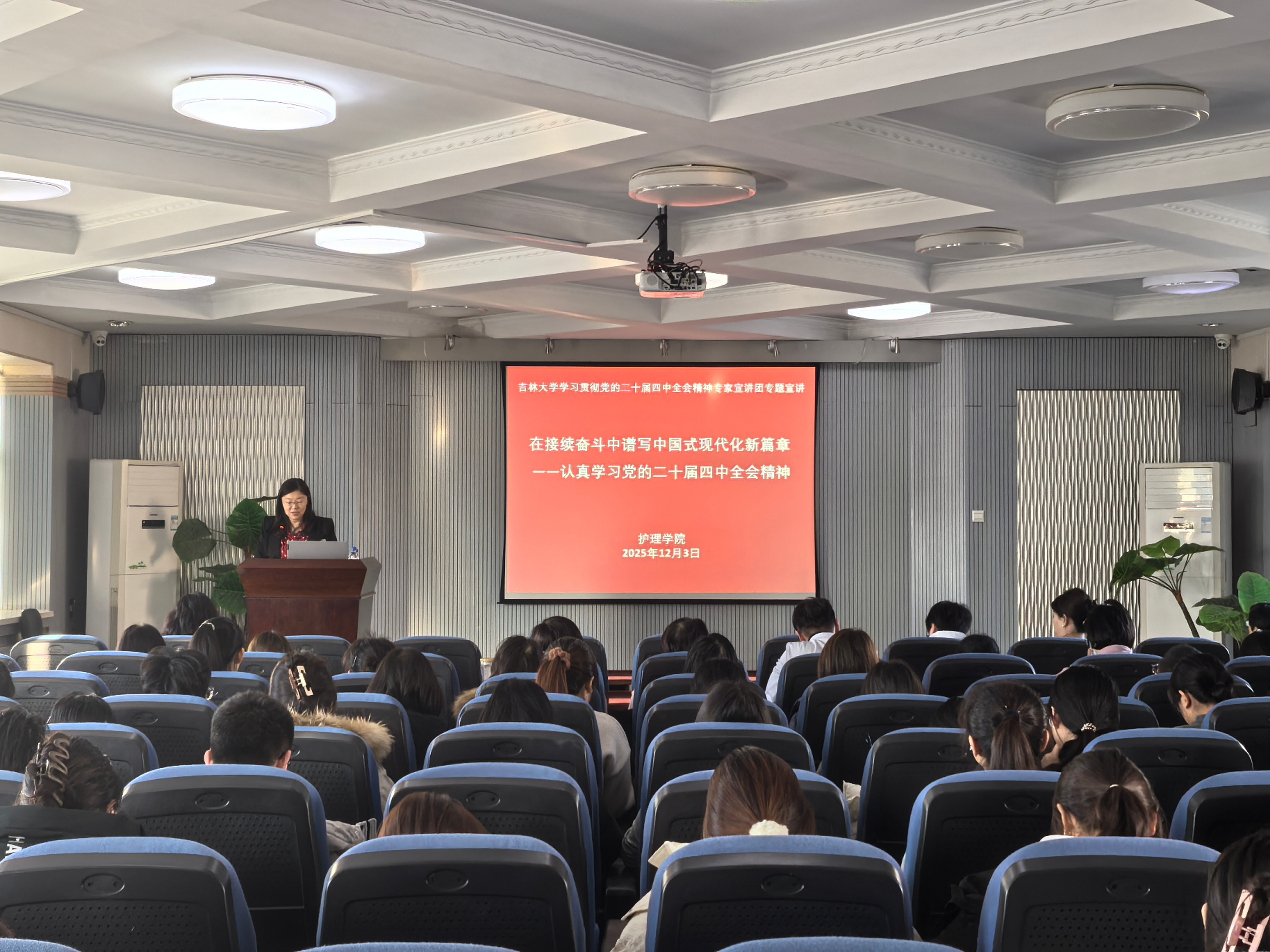 石瑛教授以《在接续奋斗中谱写中国式现代化新篇章——认真学习党的二十届四中全会精神》为主题,立足新时代发展大局,聚焦“用中长期规划指导经济社会发展是我们党治国理政的一种重要方式”“党的二十届四中全会概况及《建议》核心内容”“学习贯彻党的二十届四中全会精神,为实现‘十五五’规划贡献智慧和力量”三个方面展开系统阐释。宣讲过程中,石瑛教授将党的二十届四中全会精神与教育强国建设、民生事业发展紧密结合,尤其聚焦护理学科、医学技术学科在健康中国战略中的重要作用,用鲜活案例解读政策内涵,用专业视角分析发展机遇,紧密贴合医学教育、人才培养实际,为学院下一步学科建设、教学改革、师资发展等工作提供了合理建议。