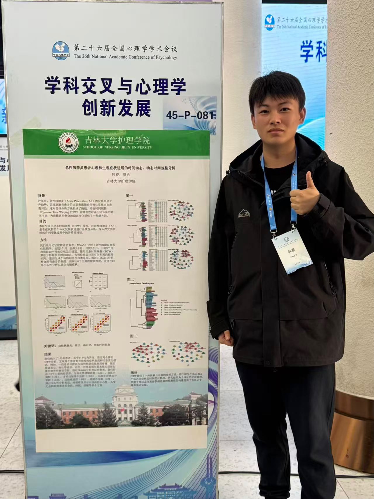 人文护理教研室主任贾勇副教授携硕士研究生韩睿分享了最新研究成果获同行关注。贾勇副教授在护理心理学专题研讨会上做《老年阈下抑郁干预的循证图谱及数字化回忆干预解决方案》报告,梳理循证证据并提出创新性数字化干预方案,为老年精神健康问题提供新思路。韩睿同学在展贴报告环节展示《急性胰腺炎患者心理和生理症状进展的时间动态》研究,获专家建设性意见。