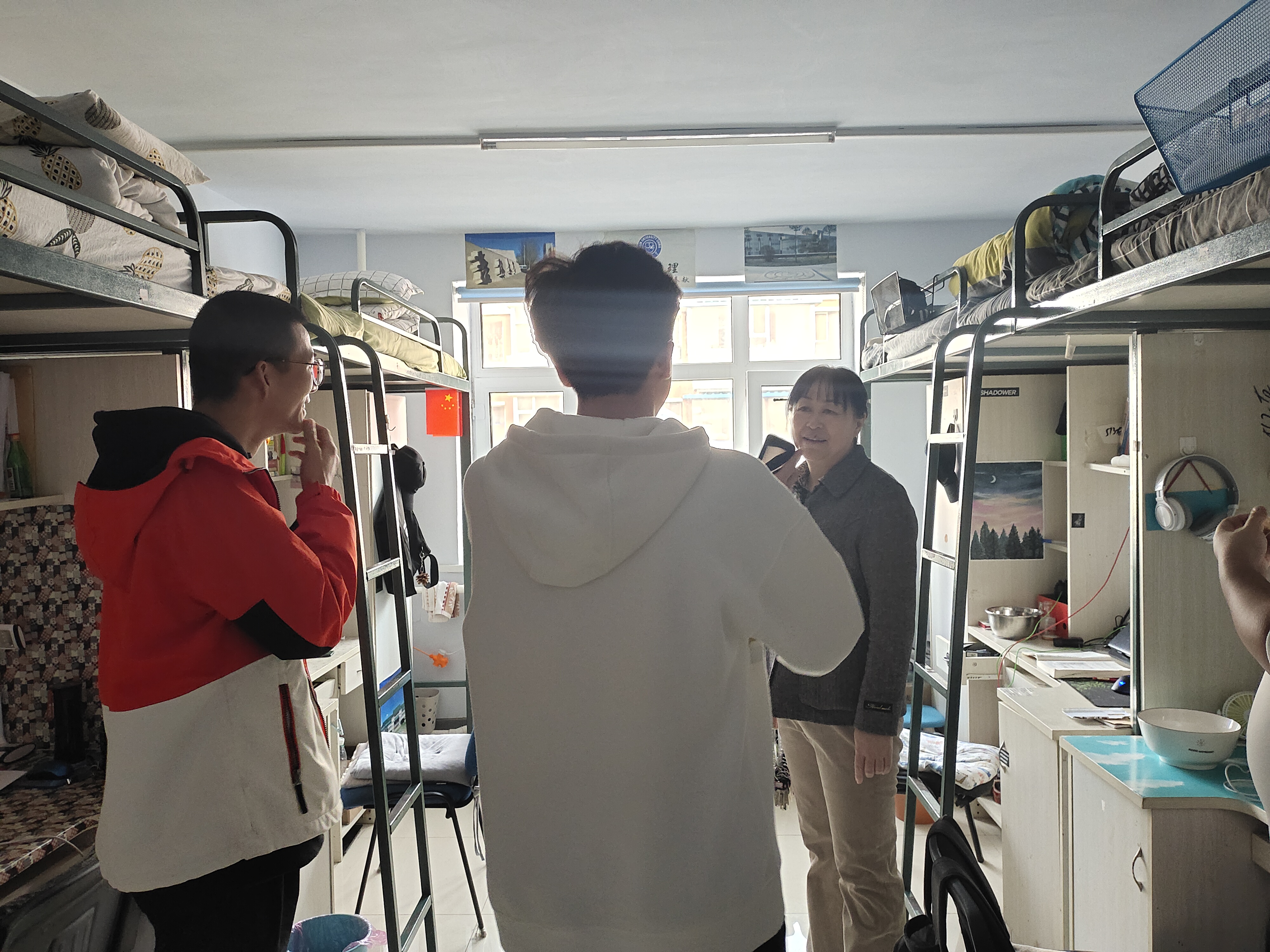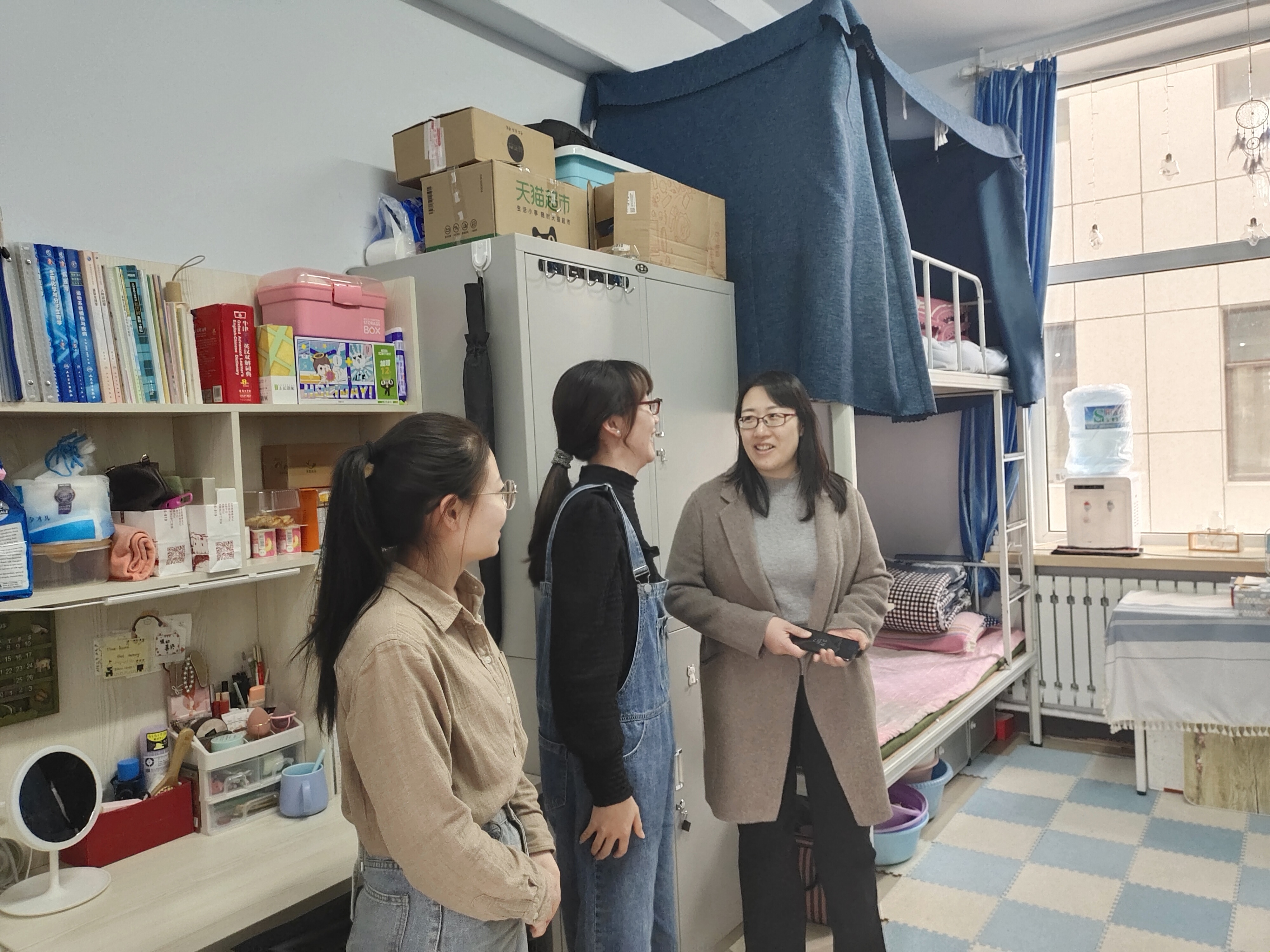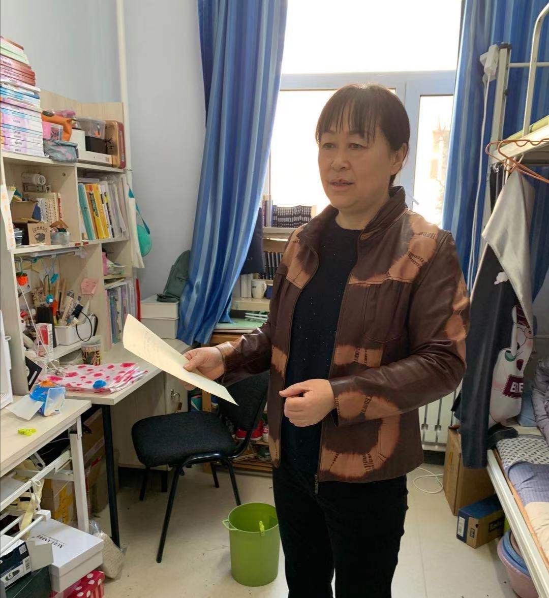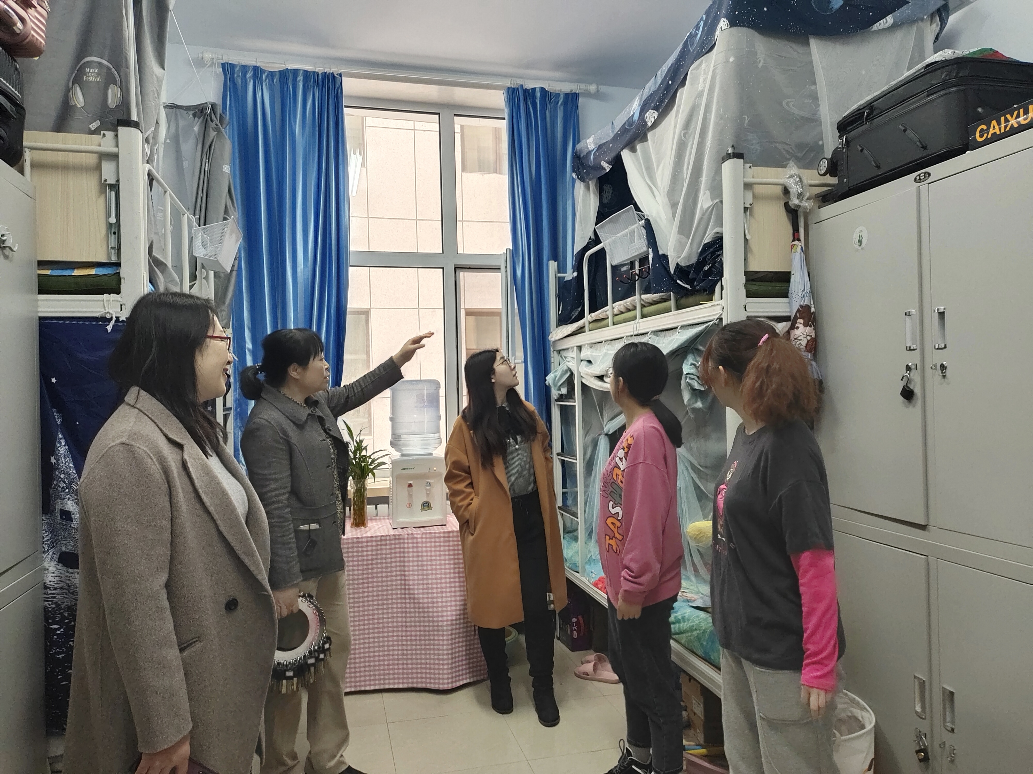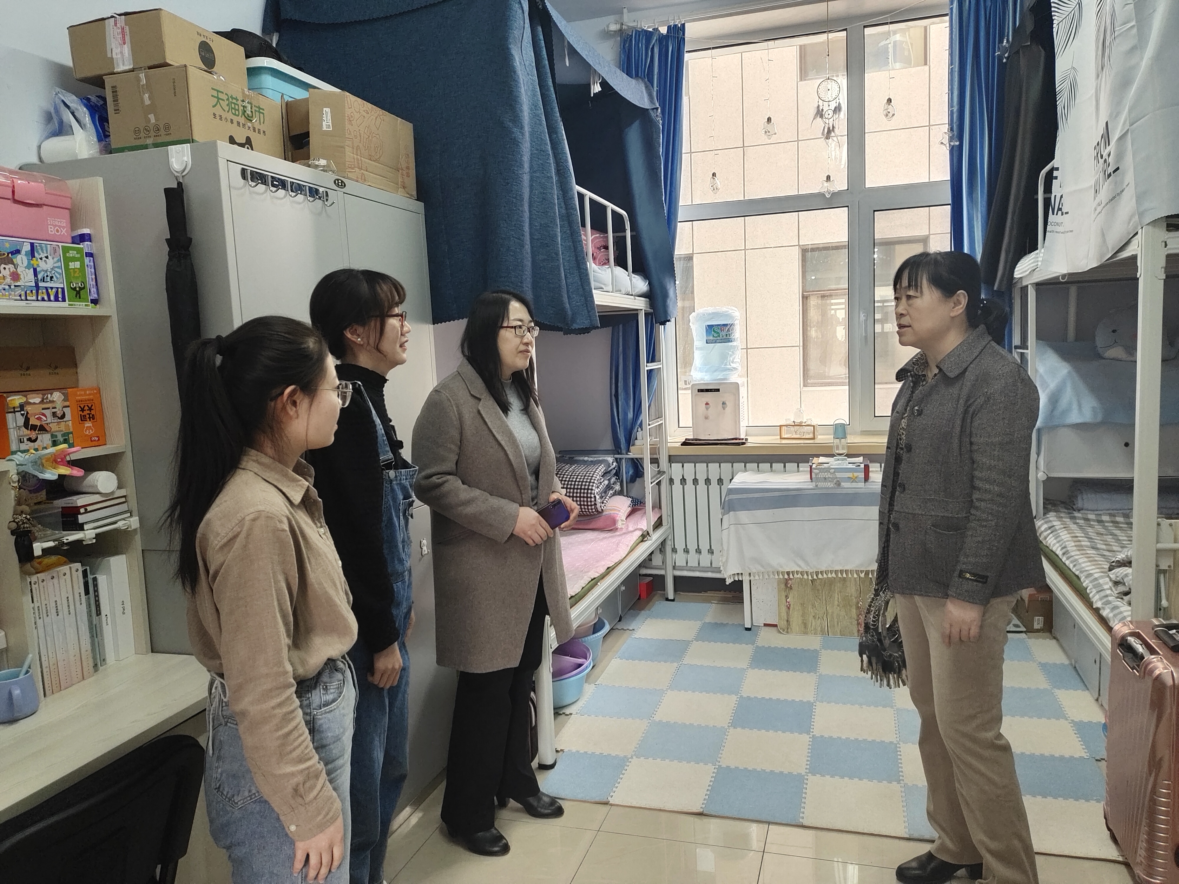 党委书记兼副院长葛宗梅、辅导员李亚琴、常方圆、刘宇飞在开学之初对学生公寓进行了走访检查。