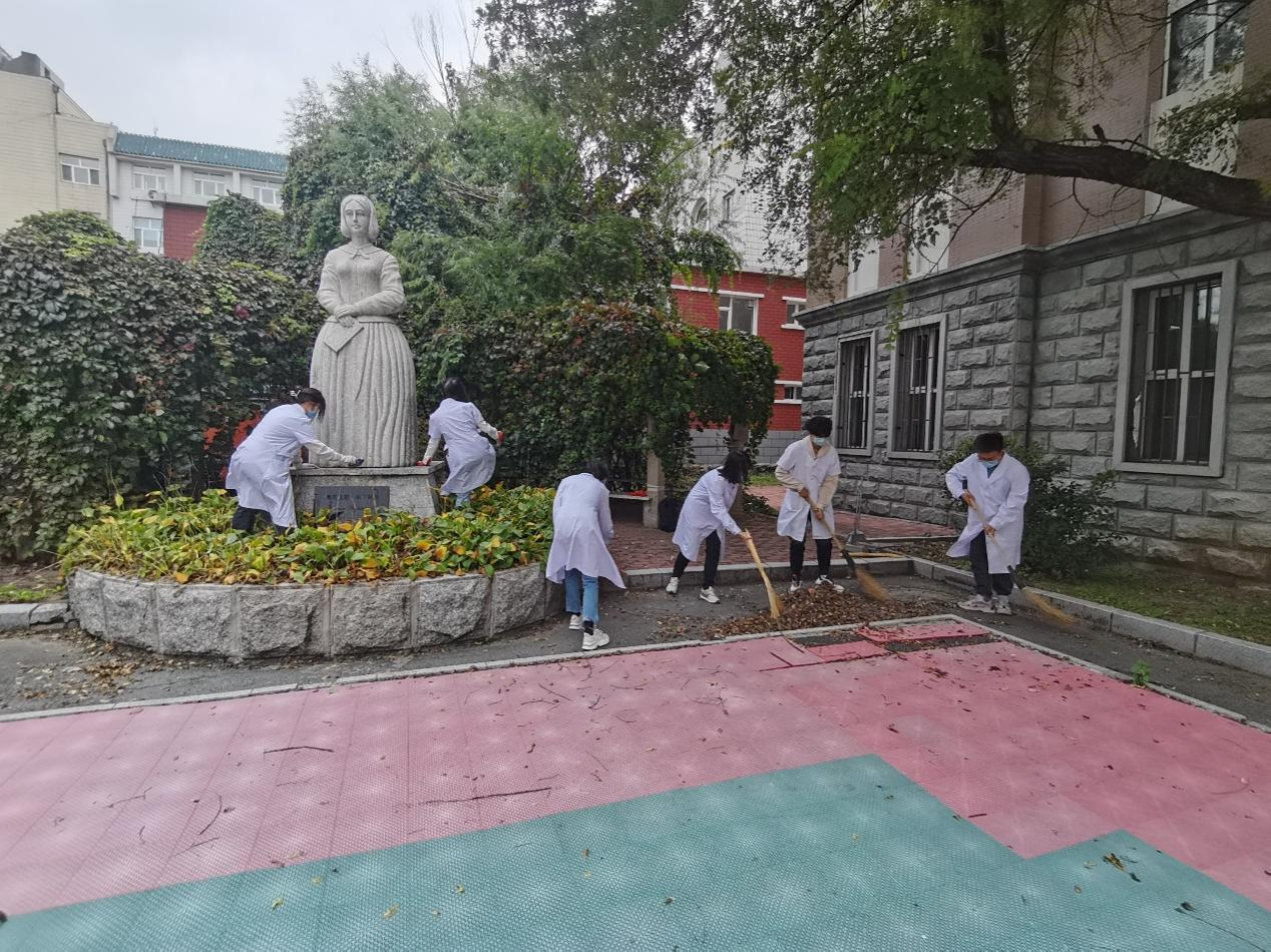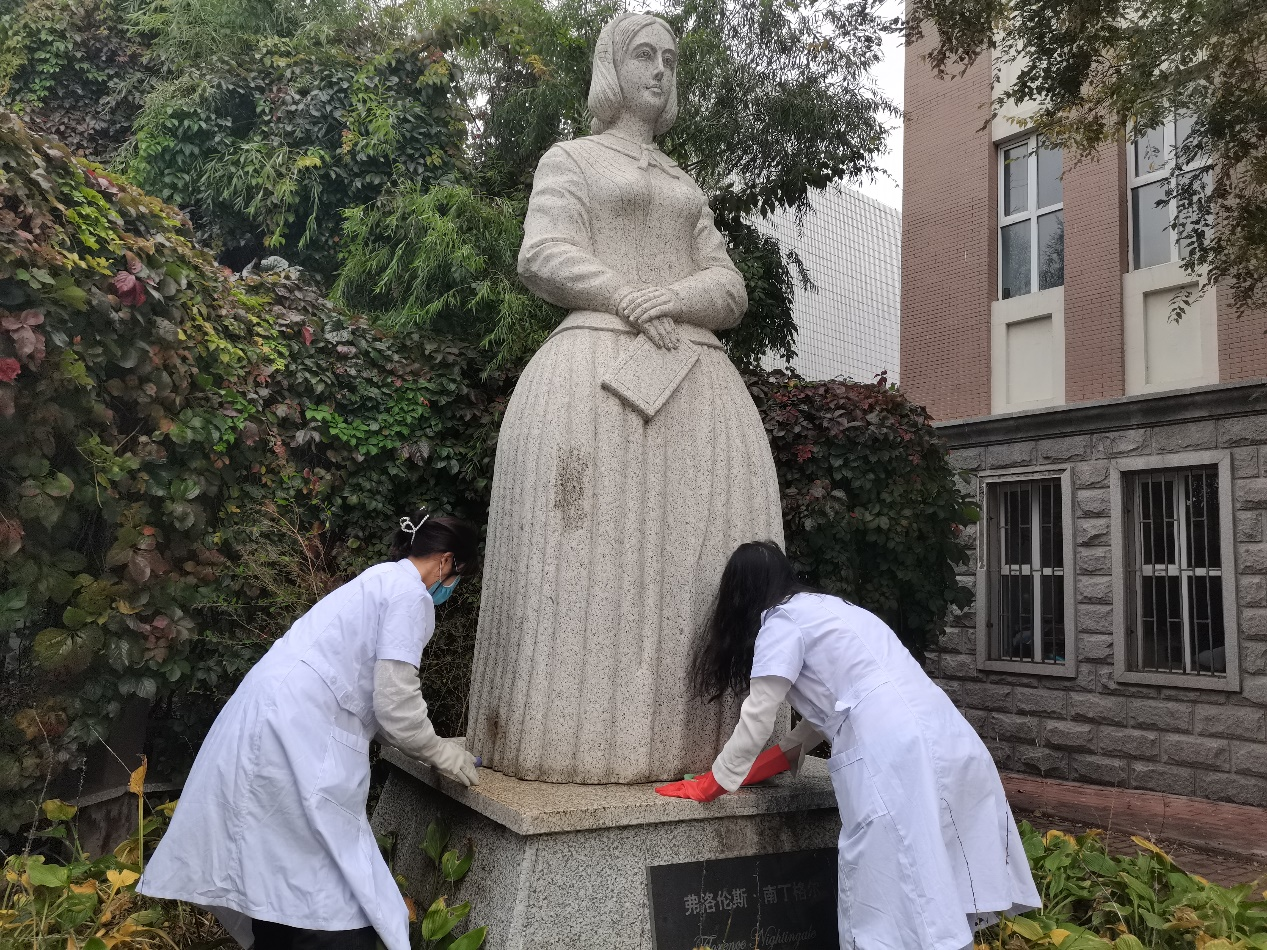 院内,为南丁格尔雕像拂去微尘,扫清其周围落叶,站在雕像面前默默纪念,内心重温南丁格尔 “终身纯洁,忠贞职守,竭诚协助医生之整治,务谋病者之福利”的誓言。用自己的亲身劳动来表达对“提灯女神”的最大敬意与无限哀思。
