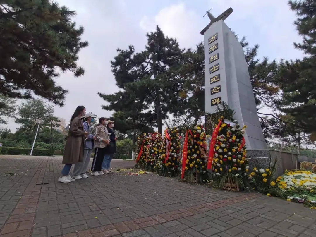 “秘密组织310”劳动小队于10月3日上午抵达胜利公园,踏入公园的那一刻起,四人便收起笑脸,神情肃穆。走到纪念碑前,四位成员敬献上准备好的鲜花,并久久伫立。看着碑上镌刻的文字和碑顶威风凛凛的战斗机,仿佛这位身经百战、热心于中国空军建设的革命先辈在向四位同学讲述着悠久的故事。这天秋风瑟瑟,社会各界群众送来的花篮有的被吹倒,碑前布满落花落叶。四人一起将花篮扶起,向物业借来扫帚清扫落花落叶,用带来的棉布拂去碑面的灰尘。“回望是为了永恒的纪念,缅怀是为了更好的前行。每一个为国捐躯的英魂都会被铭记,每一种精忠报国的精神都会被仰望。通过这次实践活动,我们认识到劳动不仅仅是身体的疲惫,更是心灵的抚慰。”