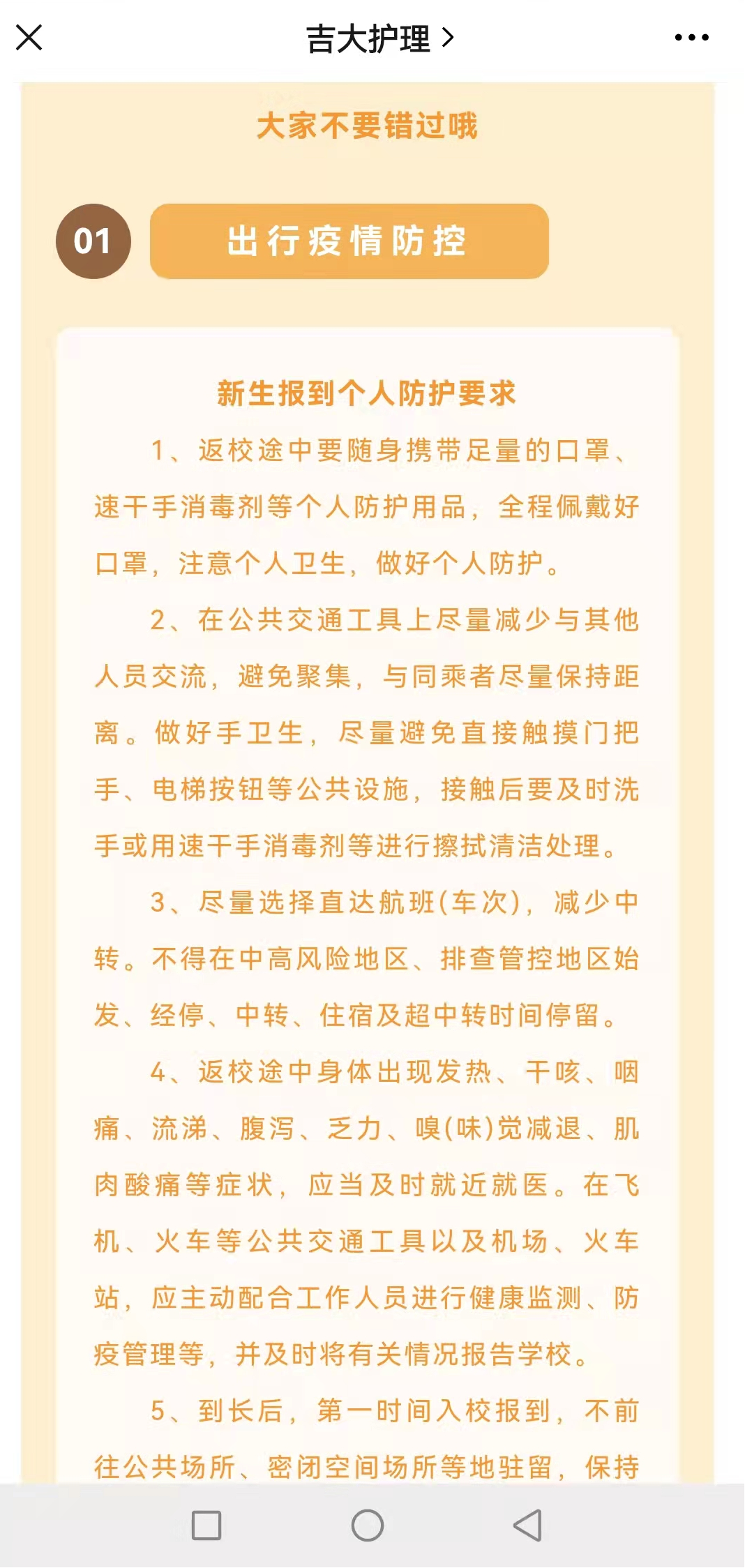 运用新媒体平台开展新生防疫知识宣传和防护指导工作,帮助同学们加强个人防护意识,引导学生正确掌握基本疫情防控措施,确保新生平安来校报到。新生可通过吉大护理公众号新生入学指南系列,全方位了解新生报到的各项准备工作,更加清楚地了解最便捷的报到路线、乘坐校园小巴温馨提示等。除此之外,新生报到的必备材料、报到各项要求也详细地包含在推送中。不仅帮助新生提前做好报到准备工作,还能够帮助新生进一步了解看漫画手机版