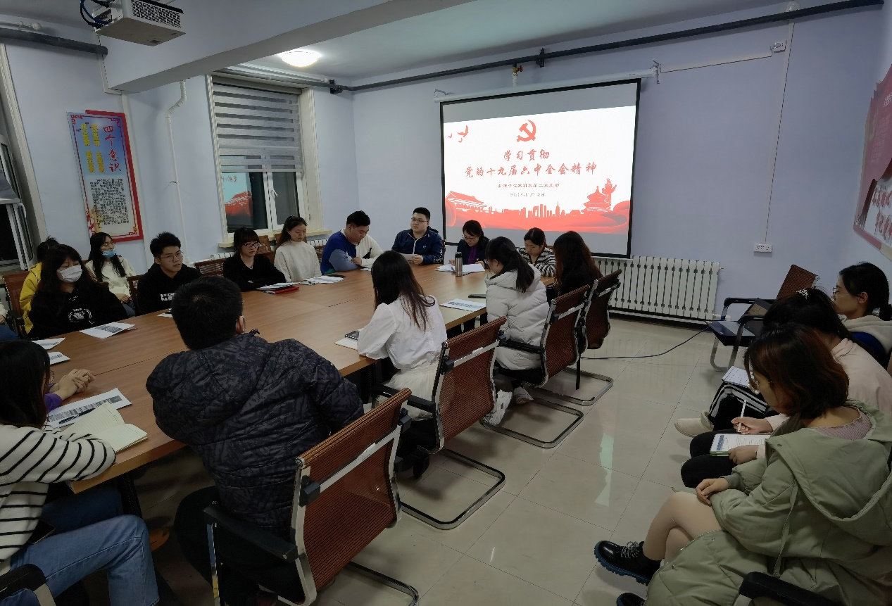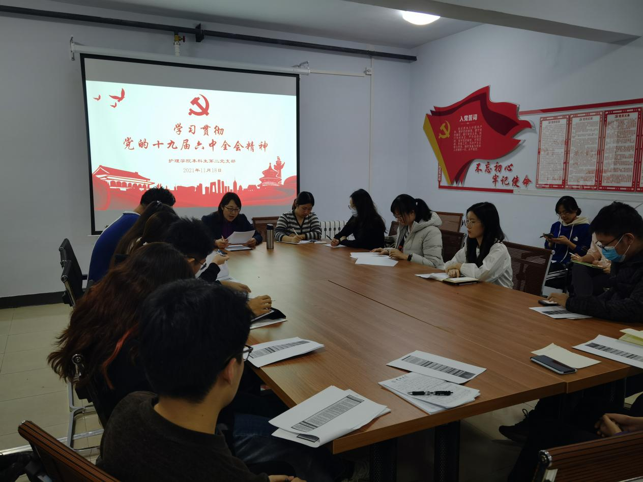 本科生第二党支部于11月18日晚在学生党员活动室召开了学习贯彻党的十九届六中全会精神会议。学院党委副书记兼副院长葛宗梅和支部党员参加了本次会议。